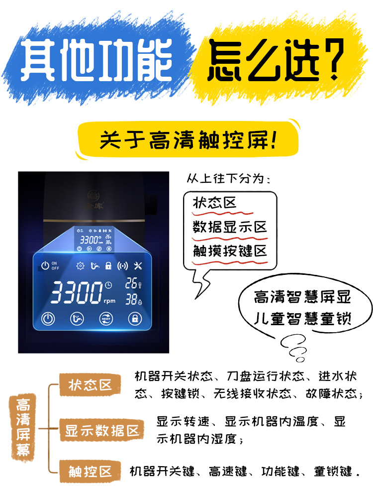 高颜值高清屏显,机器状态一目了然,可触控开关,(可作为备用开关),智慧童锁,防止误启,家人使用更安心。